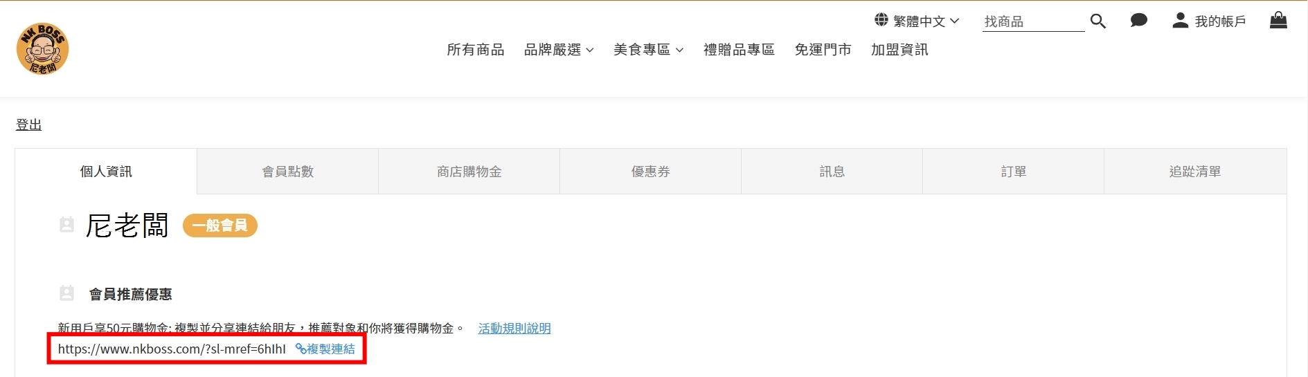 步驟一:登入會員進入「會員中心」>「個人資訊」,找到「會員推薦優惠」區塊,點擊「複製連結」,即可成功複製會員推薦連結。